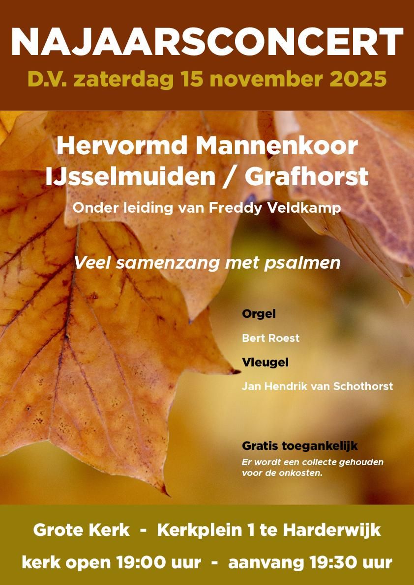 Het Hervormd Mannenkoor IJsselmuiden-Grafhorst o.l.v. Freddy Veldkamp geeft een najaarsconcert in de Grote Kerk van Harderwijk. Mannenkoor met het geestelijke lied en samenzang met psalmen. Orgel: Bert Roest en vleugel: J.H. van Schothorst.
