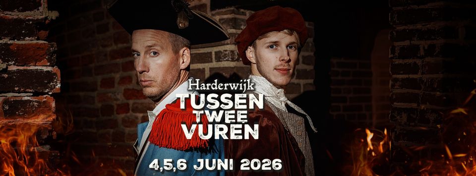 Op 4, 5 en 6 juni 2026 is de zesde editie van het Podiumspektakel: Harderwijk tussen twee vuren. De jonge Polle Kempers komt in 1672 in Harderwijk om te studeren aan de universiteit. Helaas is hij niet de enige nieuwkomer in de stad: al vrij snel na zijn komst komen er ook 2300 Franse militairen de stad bezetten. We volgen het wel en wee van Polle, die als een blok valt voor Aleyd de Wolff van Westenrode. Hij is niet de enige: kapitein Guillaume Maisonville van het Franse leger is ook geïnteresseerd in de knappe burgemeestersdochter .